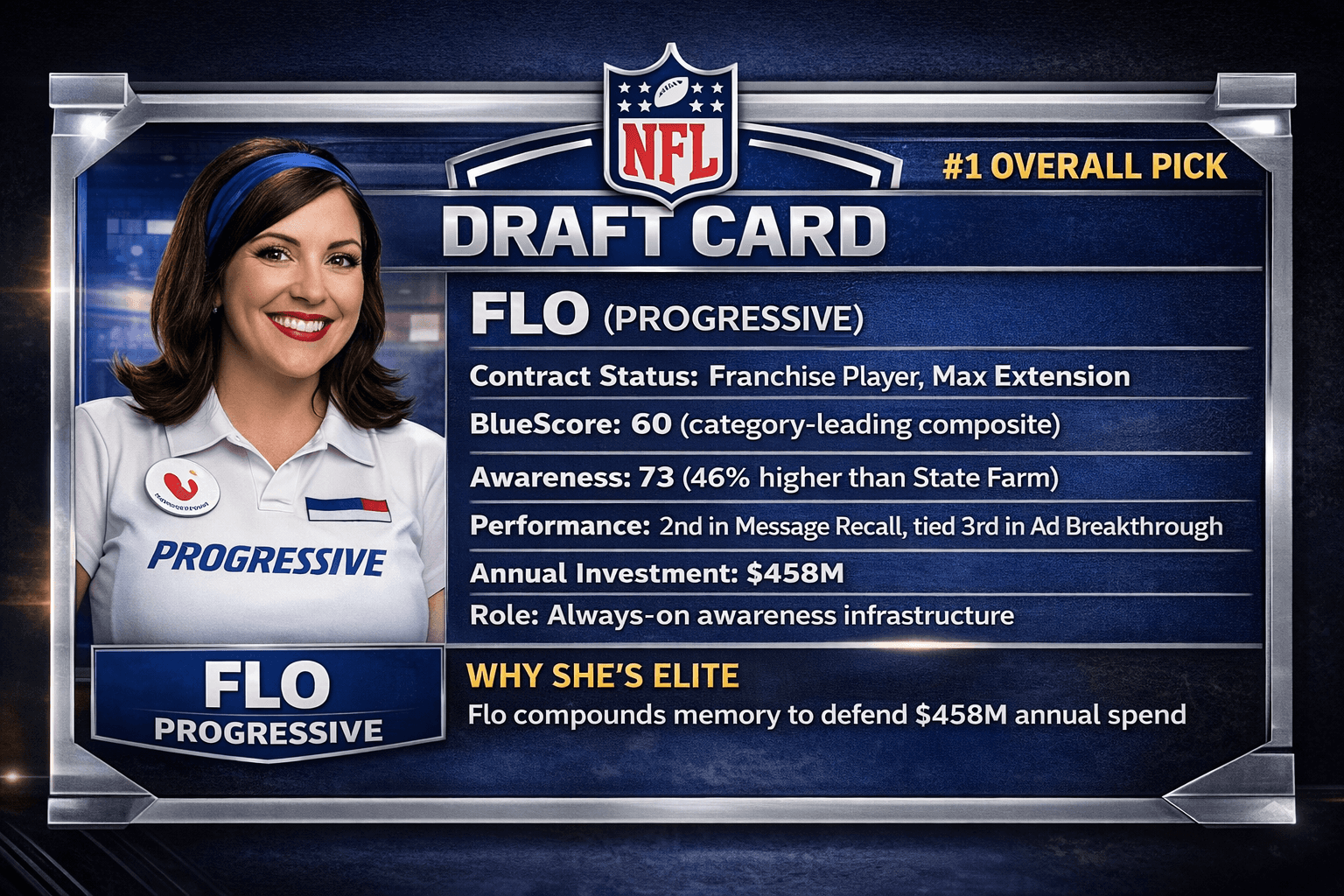 If every insurance brand walked to the draft podium today, Flo goes first. Not because she's newest or funniest, but because Progressive built an operating system that lets memory compound and consistently converts advertising investment into measurable, sustained awareness advantage.