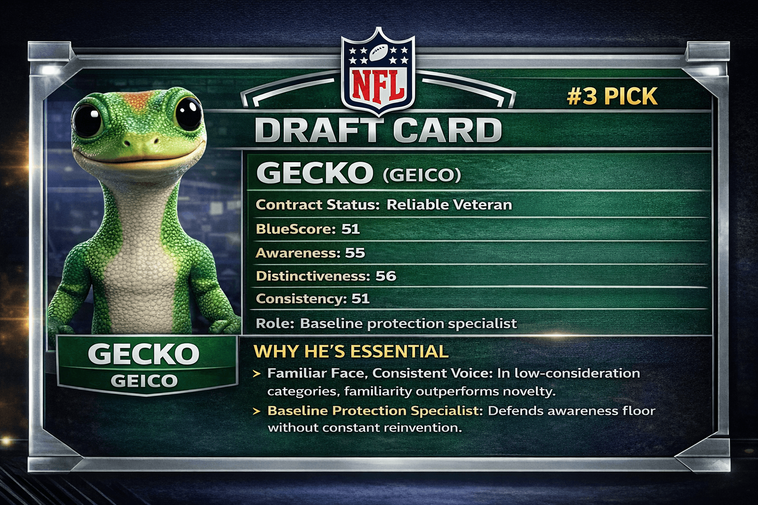 Why He's Essential: In low-consideration categories, familiarity consistently outperforms novelty. The Gecko delivers instant recognition and steady reinforcement without requiring constant reinvention.
