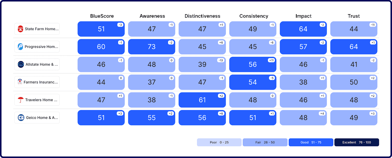 Using the BlueOcean Brand Framework - trusted by Fortune 500 companies including SAP, AWS and Intel - we evaluated insurance spokespersons the way championship NFL teams evaluate draft prospects: on sustained performance, not just potential. Our BlueScore metric aggregates Awareness, Distinctiveness, Consistency, Impact, and Trust into a single, defensible score that correlates with long-term brand advantage.