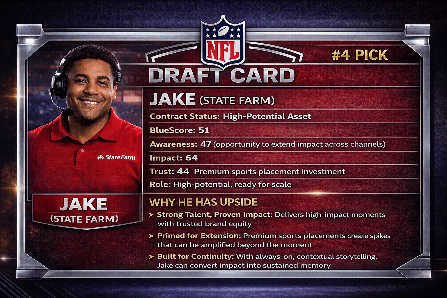 The Opportunity: Jake isn't a talent problem - it's an execution gap. Despite significant sports investment, State Farm trails on awareness. Our analysis reveals high-impact moments without narrative continuity decay quickly across all measured channels.